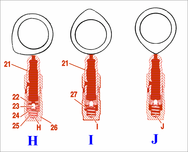 - I: Fin de la fase de auto-reglaje. El 'pitorro' 21 ha ascendido hasta el máximo empujado por el muelle gordo. Las presiones de aceite por encima y por debajo de la bolita se igualan, su muellecito la empuja hacia arriba y la cierra.