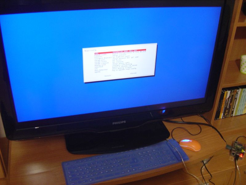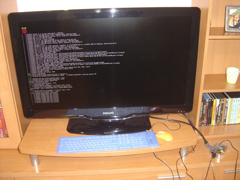 Con esto, pinchamos la tarjeta SD en la Pi, enchufamos un teclado, un ratón, cable de salida de vídeo que más nos convenga (en mi caso HDMI directo a la tele del salón) y por último enchufamos el alimentador.