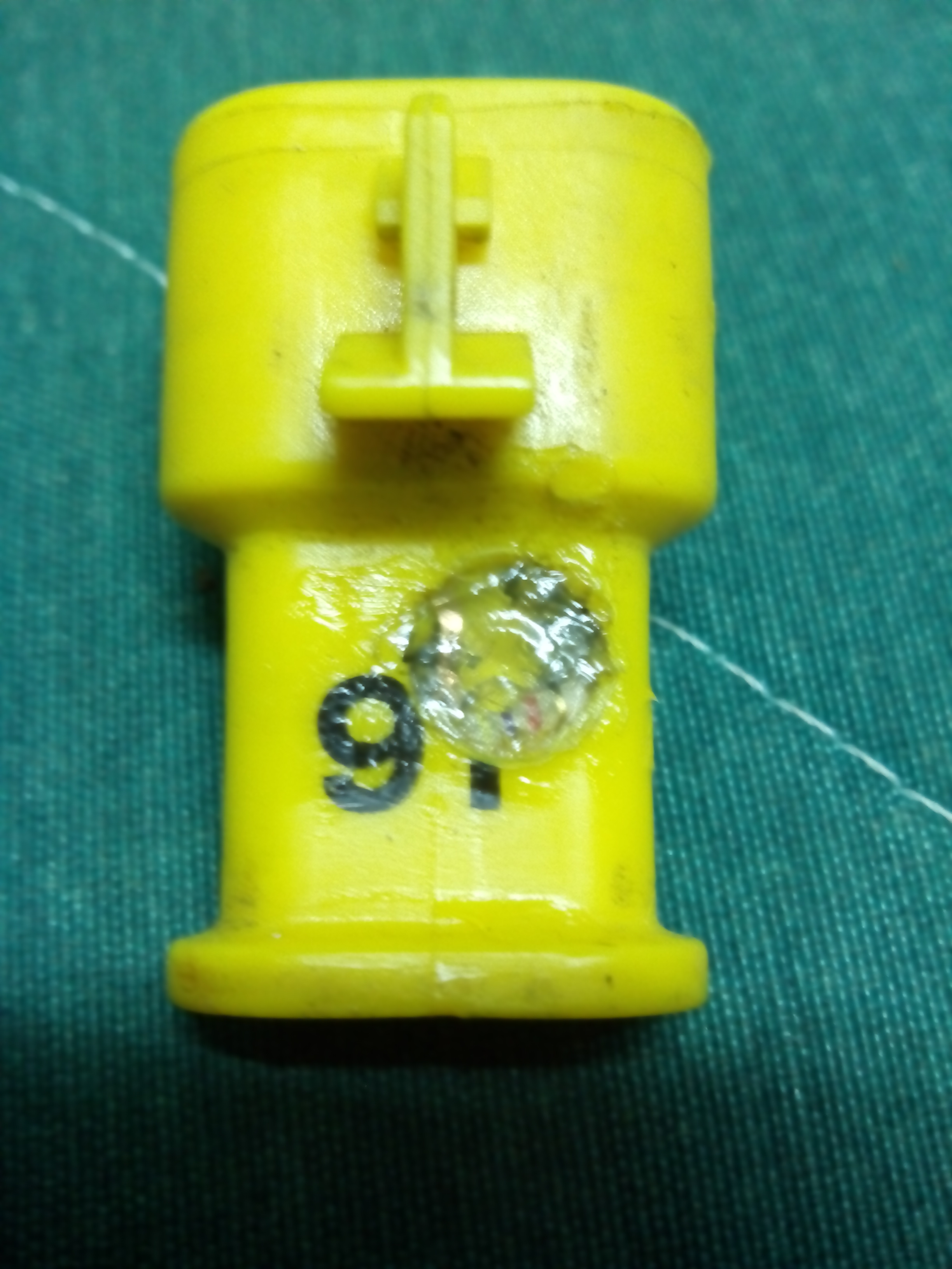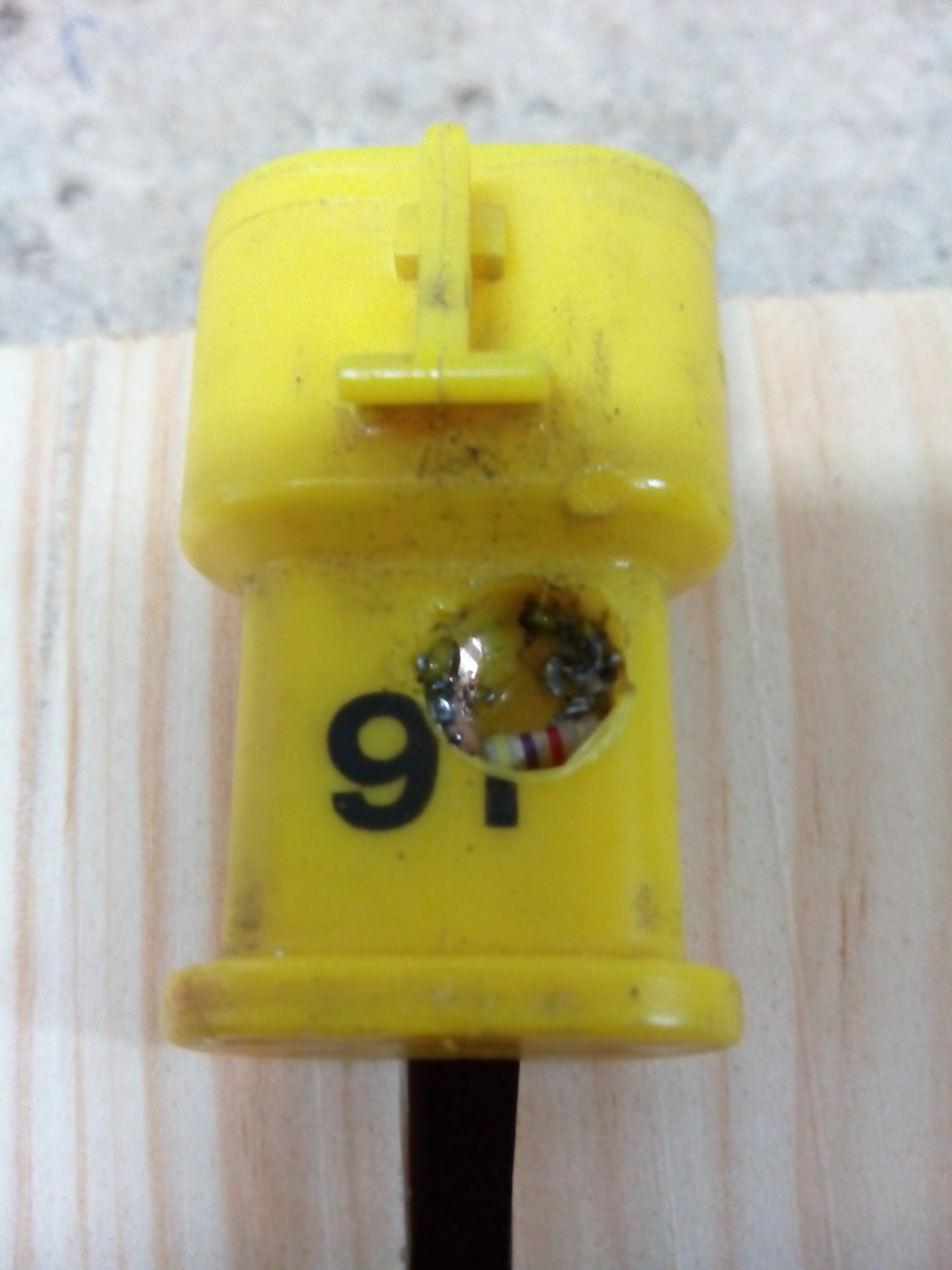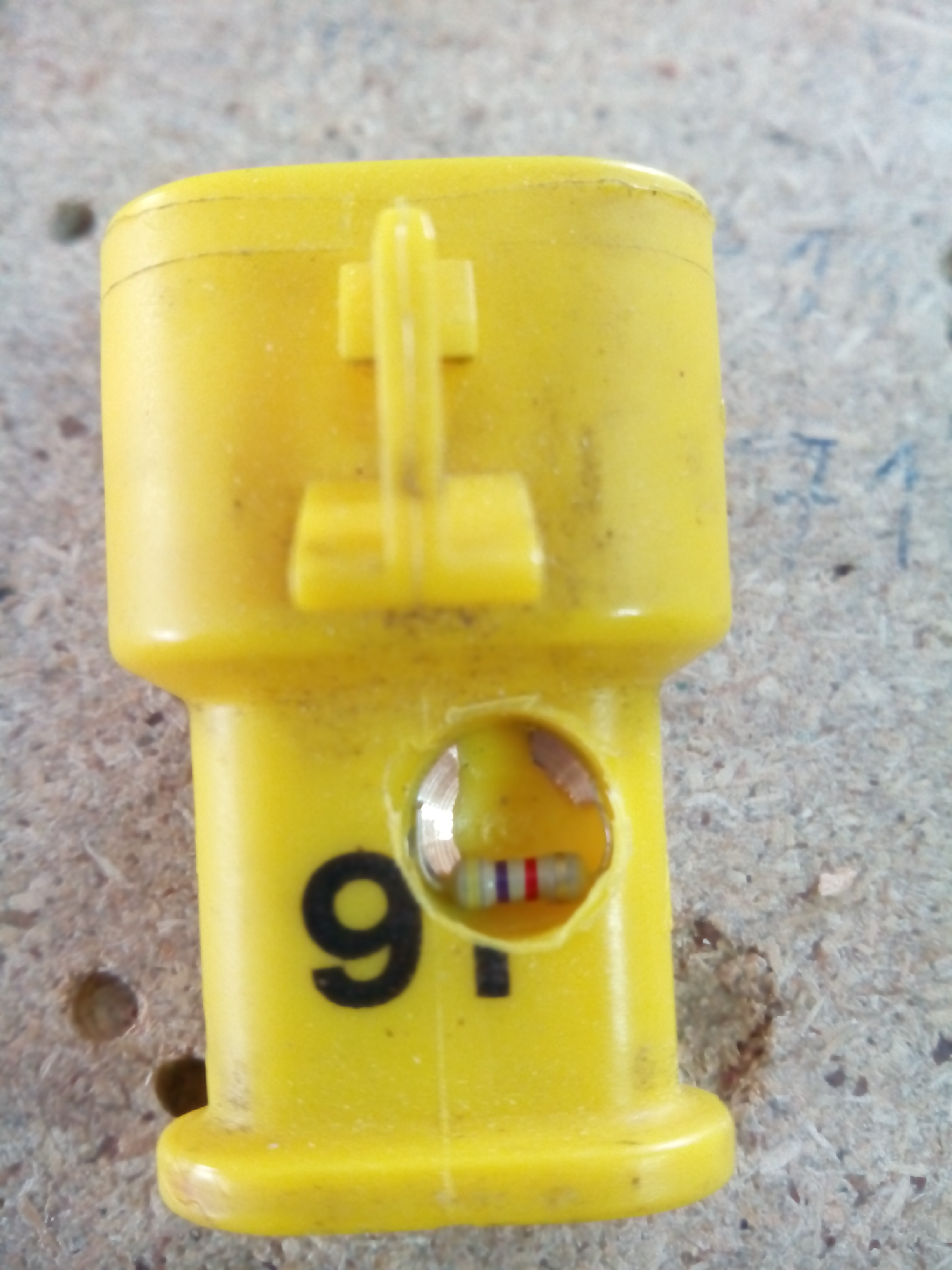 primero taladramos o abujereamos la pastilla por el lado de 91, siempre del lado derecho mas o menos entre los dos conectores de ese lado, con cuidado hasta llegar al cobre, y dejando la patilla central entera, para poder usarla en la posicion 95 tambien y la lateral cortada (para anular la resistencia que ya tiene la propia pastilla):