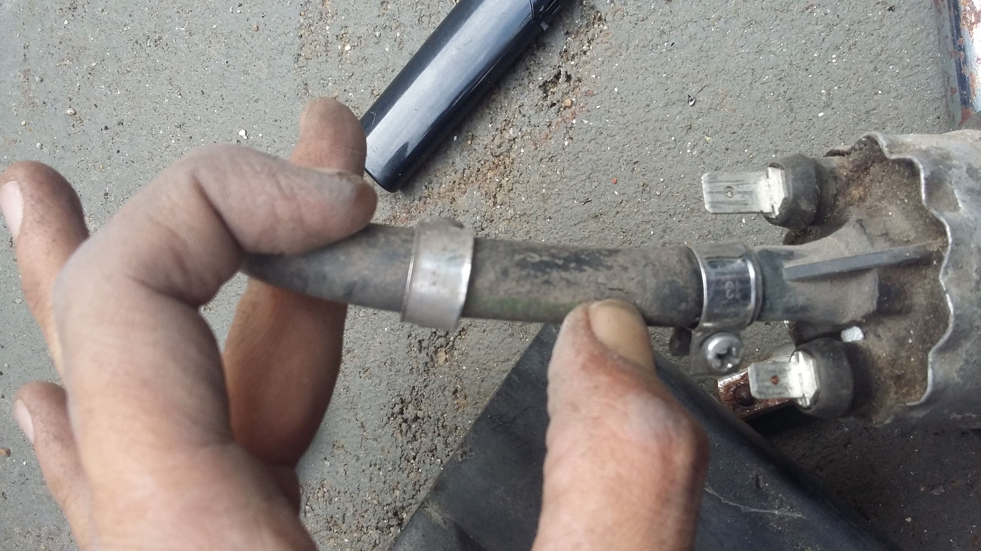 Asi que ahora tocaba bajar el deposito para cambiar la junta del aforador y el resto de cosas que hiciera falta. Ayudado por el gato y unos ladrillos se hace sin esfuerzo ninguno.Aflojamos las abrazaderas de los manguitos, sacamos el tapon y cambiamos lo que haya que cambiar, remontamos y se supone que la bomba ahora ya deberia mandar gasolina.