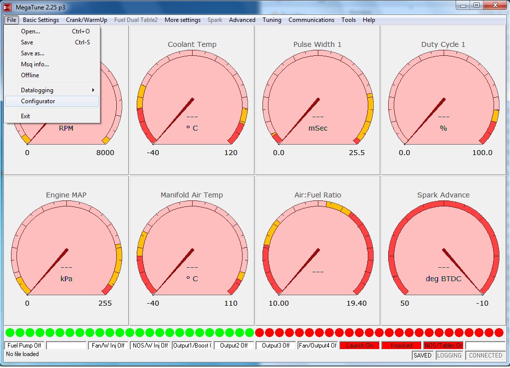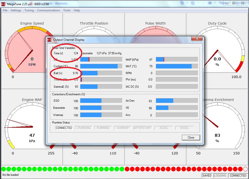 Comprobar que los leds de inyectores parpadean, se enciende la luz de la bomba de combustible fija. Al tocar los pods de los sensores se activaran tambien los leds de la MS segun lo siguiente