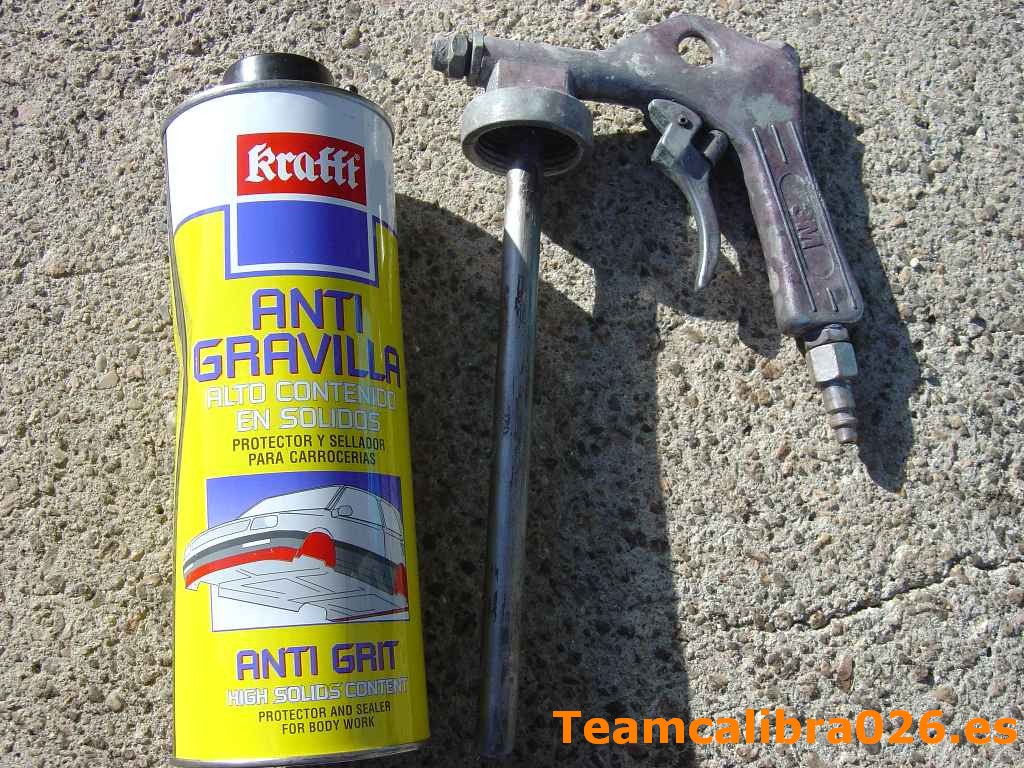 Para pintar los bajos yo lo he hecho con pistola y para esto hace falta una pistola apropiada, compresor, un foso/elevador y pintura antigravilla de color negro: