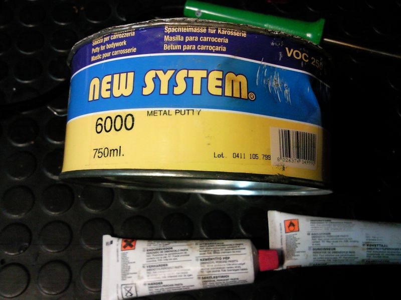 Otra opción , para tapar a saco agujeros/socabones como por ejemplo el típico hueco para la insignia del capó en el Calibra, es la de usar cemento-estaño, que viene siendo una masilla con partículas de aluminio mezcladas y que cuando se endurece se queda dura como una piedra (literal), es muy dura y rígida, asique ojo con intentar usarla en zonas que puedan necesitar flexión:
