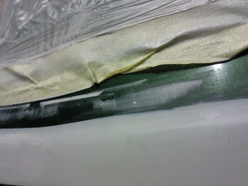 Cuando no se pintan piezas enteras y hay que enmascarar zonas que no nos interesa salpicar, hay que pegar la cinta volteada, es decir, en vez de pegarla completamente plana se pega la mitad y la otra mitad se voltea hacia atras haciendo una curva poco abrupta, de forma que al aplicar la pintura no se genere un escalón brusco entre la zona enmascarada y la que pintamos, que luego es un coñazo lijar sin acabar desbastanto demasiado la pintura vieja. Basicamente conseguiremos un degradado entre ambas zonas (el polvillo acaba entrando bajo la cinta pero no entra a chorro directamente desde la pistola), "pixelando" y suavizando la unión entre ambas zonas. Ejemplo de cómo queda al levantar un poco la cinta tras una mano de imprimación:
