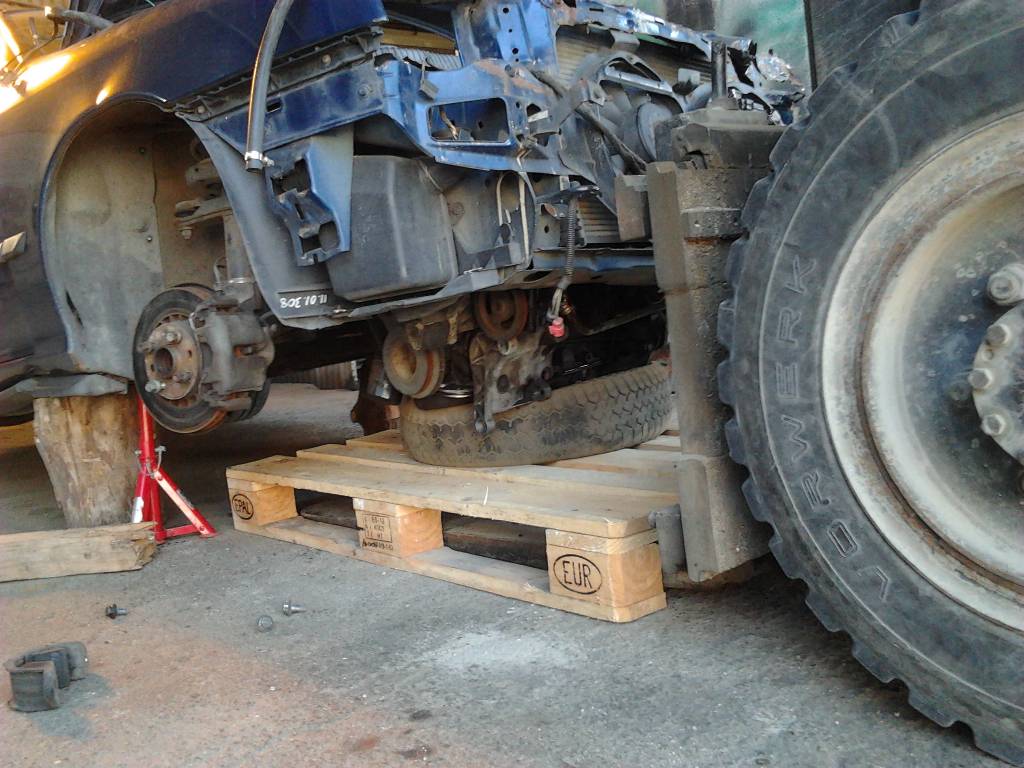 ¿no da la altura? pues vale, segunda carretilla elevadora al canto :chondo: :chondo: y una cadena enganchada al enganche de remolque delantero (con freno de mano puesto y unos calzos en las ruedas traseras para que no se vaya hacia adelante):