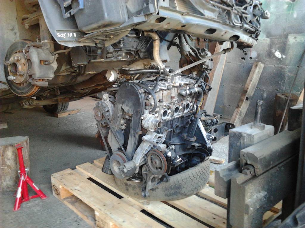 Palet al canto, un neumatico viejo centrado justo a la altura del carter y se mete la parte profunda del carter justo en medio del neumatico, asi cuando la mecanica se pose por completo en el palet, quedara perfectamente equilibrada (eso si, hay que tener el escape desmontado). Cuando el palet o lo que sea que aguante el motor, este ajustado contra el motor, entonces es momento de soltar los tacos de motor delanteros, asi el motor ya se queda completamente suelto (si ya se ha soltado la cableria, cable de masa de la caja de cambios, tubos de gasolina, liquido de direccion y cacharrada varia que rodea la mecanica):
