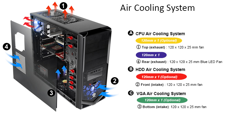 - 5 butrones de refrigeración, todos para fan de 120 ( ). En particular uno o dos fans en lo alto excretando calor, y uno abajo chupando frescor, paréceme sabio (son las costumbres del aire caliente, y hay que respetarlas):