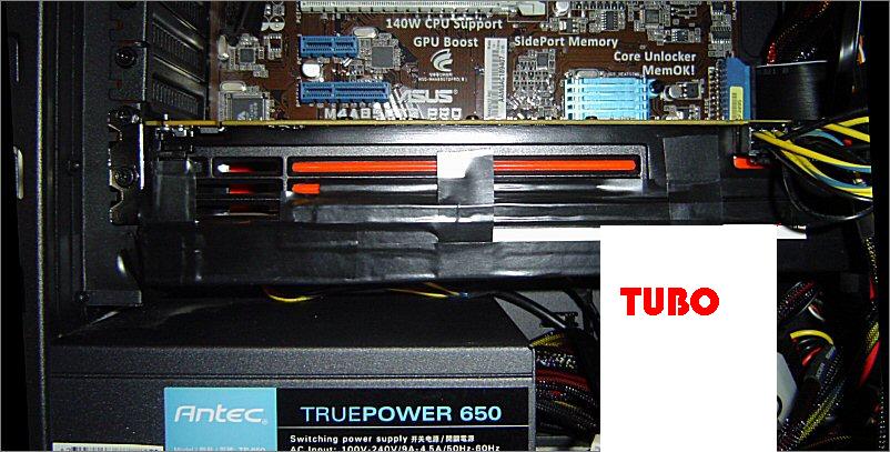 Experimento de toma RAM para la GPU. La idea es que el fan centrífugo ('squirrel-cage' blower) solo degluta aire del exterior de la caja, más fresco, desde la parte trasera. El duct es algo así como la caja de cartón de una tableta de turrón acoplado a la GPU: