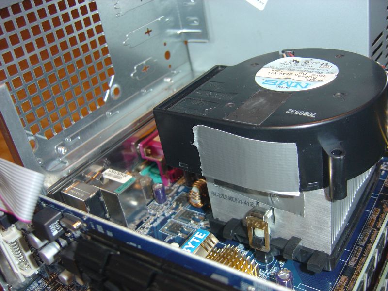 Pues ATPC, rapiño el ventilador DELL, lo planto encima del disipador del sempron, lo atornillo de medio langueta con un tornillo y como el ventilador se me sale del pais, el resto... sujeto con cinta americana que eso no falla