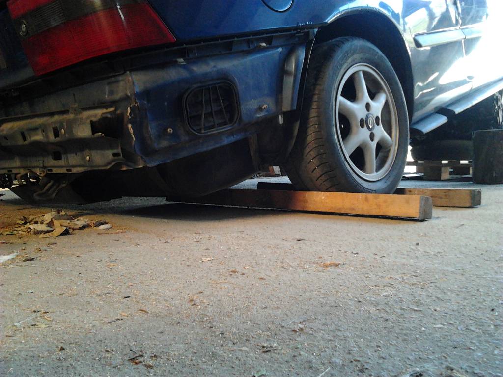 Con borriquetas no te da, hay que ingeniarselas para ir subiendo mas la carroceria. Incluso habria que subir primero el coche a unas tablas o algo asi en las ruedas traseras para ganar altura de atras, de otra forma al levantar mucho el morro, acabaria tocando el culo contra el suelo y como tengas montado el escape o la defensa... djudju.